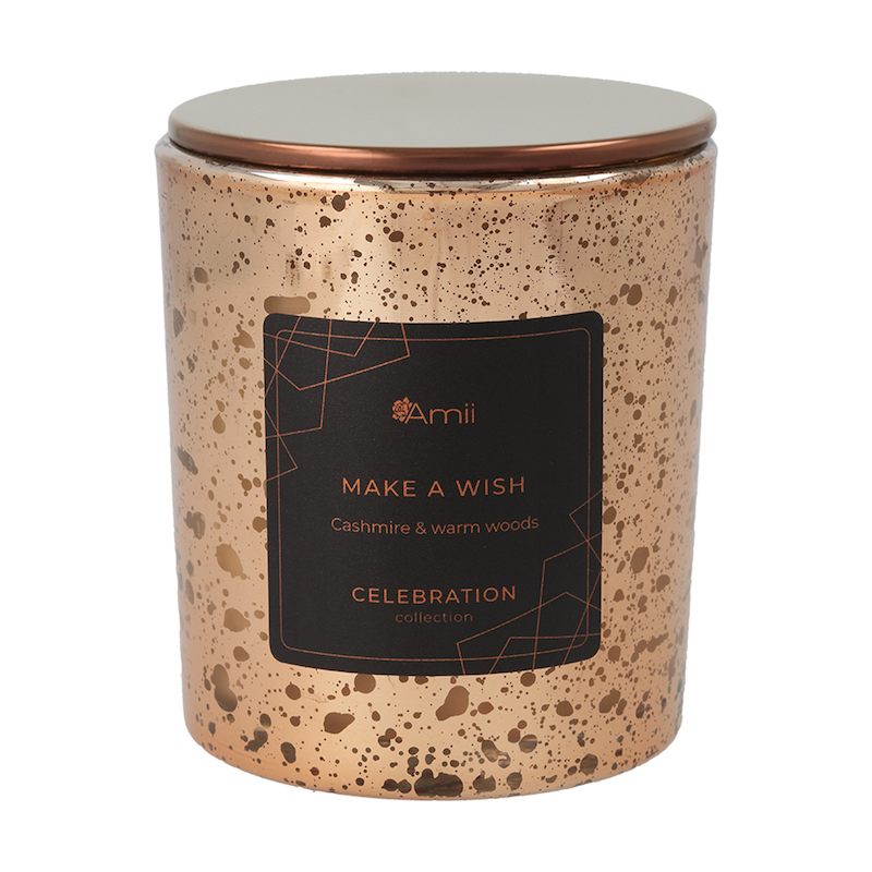 Gorgeous cashmere with a touch of wood grain. Luxurious and elegant. The particularly glamorous rose gold glass with the same colored lid makes the candle festive.